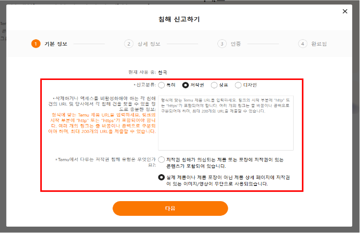 신고 분류(특허, 저작권, 상표, 디자인) 선택 → 신고하려는 테무 제품 URL 입력(여러 개 동시 입력 가능) → 저작권 침해 유형 선택