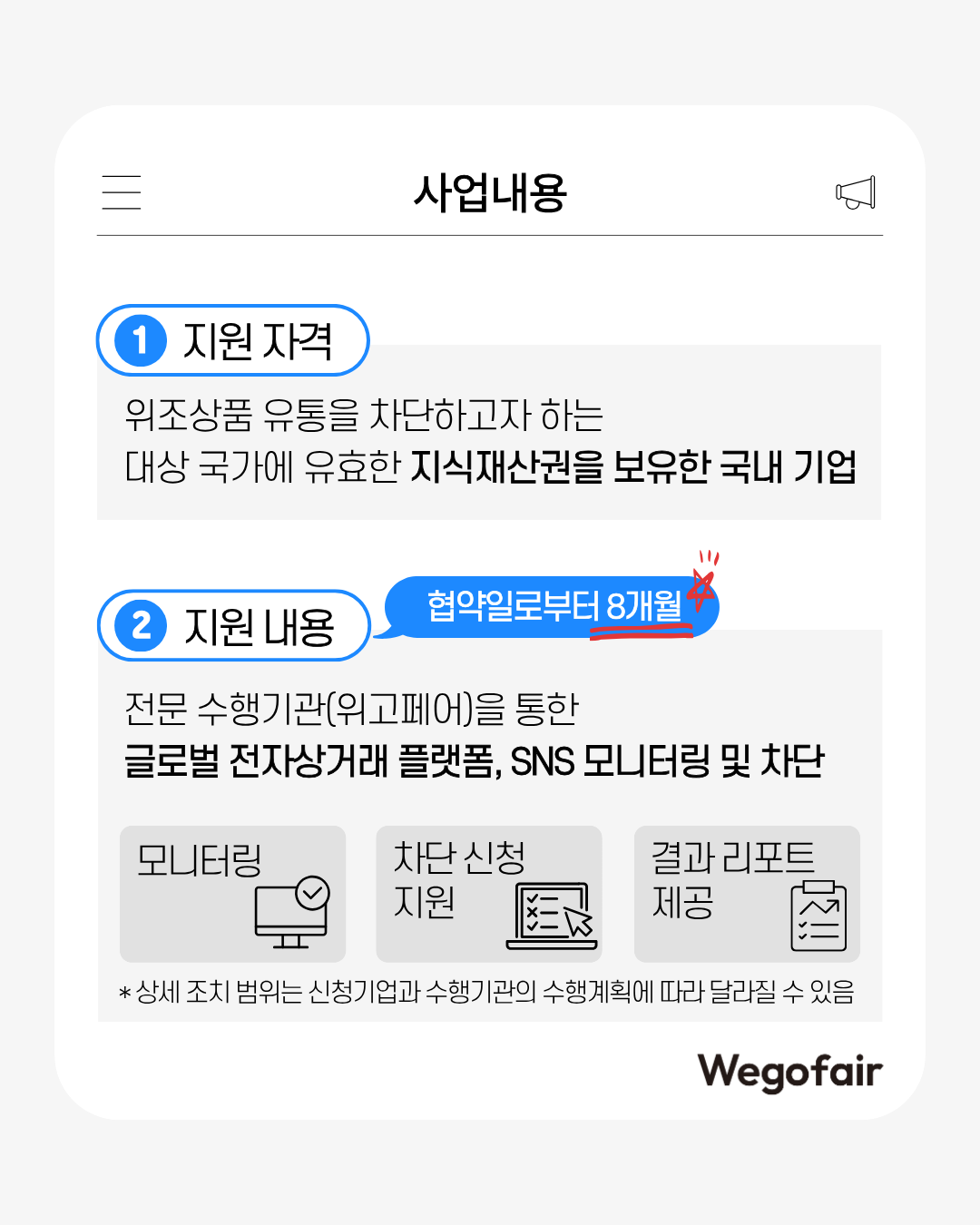 • 대상: 해외 온라인 위조상품 및 불법 리셀링 등 브랜드 침해 단속이 필요한 기업
