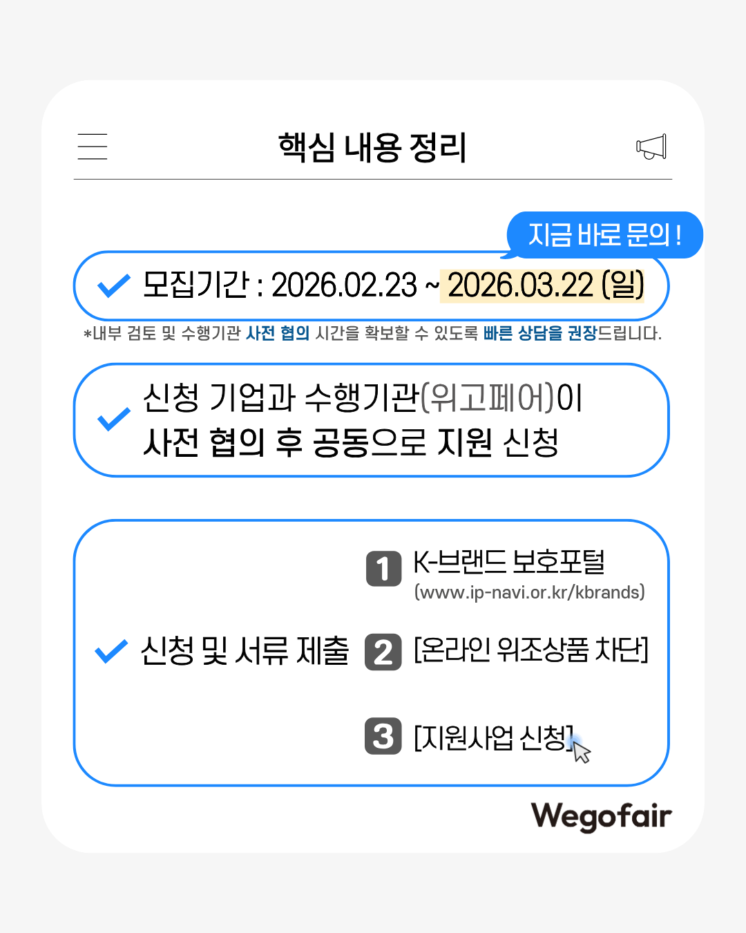 모집 마감(2026.03.22)을 고려해, 내부 검토 및 수행기관 사전 협의 시간을 확보할 수 있도록 가능한 한 빠른 상담을 권장드립니다.